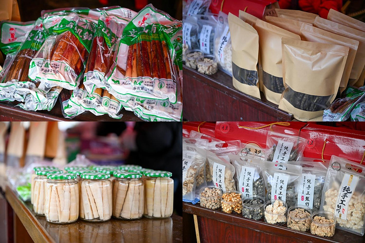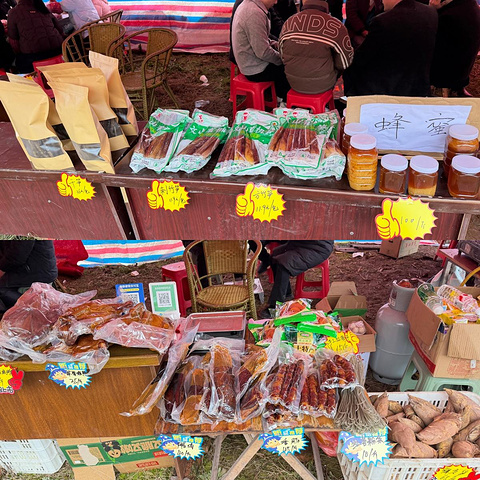 各色山野干货散发着质朴的香气,鲜嫩的脆笋还沾着山林晨露的湿气,手工糖、油炸小吃、奶茶果汁……味道好,价格还特别实惠!边逛边尝,一圈下来,手里早已是大包小包了~