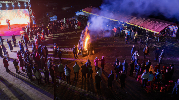 天刚擦黑,村里的篝火晚会也要开始了,火焰越烧越旺,热浪驱散了山间的凉意。