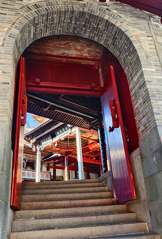 跨过仪门拾阶而上,经一道砖砌的拱门,进入主殿。只见祖庙为中轴线布局,气势恢弘,飞檐翘角,古老的的气息扑面而来。