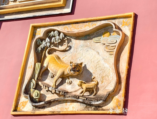 竖额两边由两只四爪青龙簇拥着。在古代,皇宫里面的龙是五爪金龙,而四爪青龙则象征着等级规制仅次于帝王。