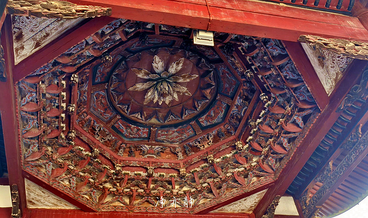 其独具风格的八角藻井是榫卯莲花顶,采用榫卯结构工艺,没有用一根钉子、一根铁线,都是用木头榫卯拼接起来的。