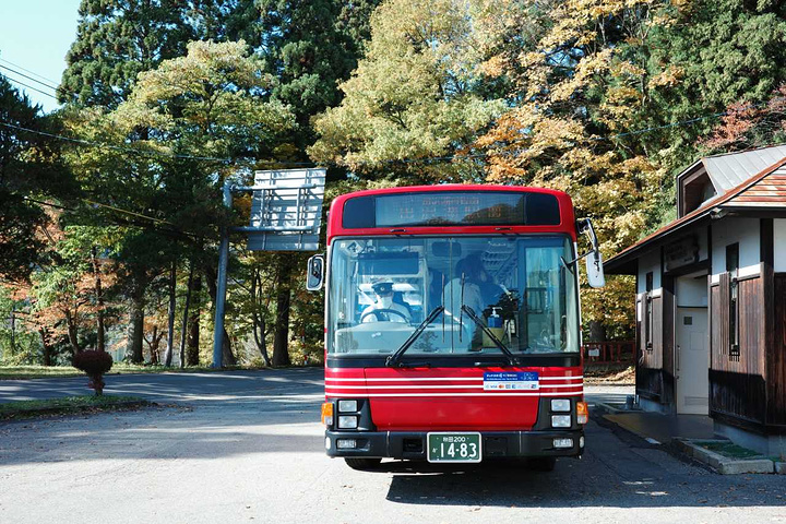 田泽湖一周线巴士现在统一车上买票,先上车,下车时候买票。正值赏秋之时游客众多, 还加开了几班车次。车子在金黄色的落叶树和秋田杉中穿梭,而湖水就在一片树林后迎了上来。