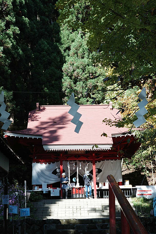 御座神社前也有不少游客拍照,毕竟红色鸟居与蓝色湖水的撞色也是美得不行。如果是冬天,白色的积雪加持更是出片。