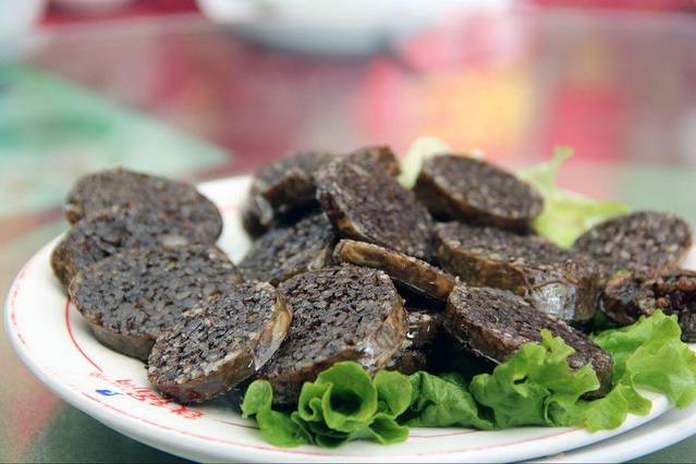 是用猪血和糯米混合在一起,然后塞进猪大肠中腊制的。吃的时候,斜斜地切出来薄薄的一片片,用油一炸即可上桌。口感上酥中带韧,糯香肉香交织在一起,喜欢黏糯口感的人应该会喜欢。