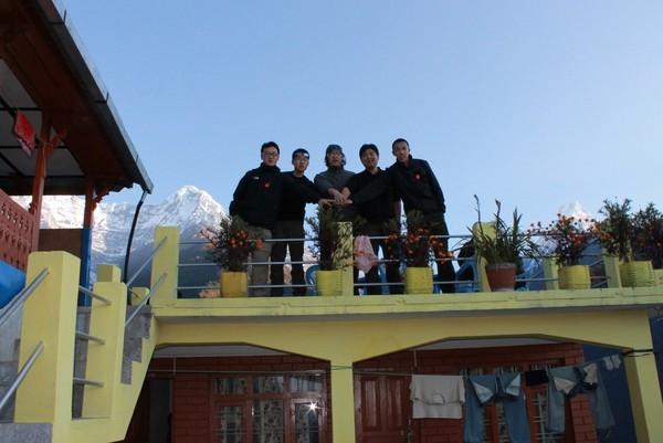 从abc下撤45分钟,我们就到了mbc,拿回昨天寄存的东西,继续下撤,在1点的时候已经到了前天入住的himalayan。我们在那里吃了午饭。由于早上晚出发一小时,所以没有到达预定的chhomrong,而是在天黑之前在上一站sinuwa住下了。当我们到的时候已经没有房间了,好心的主人把他们自己的房间空出来给我们住,特别推荐这里,这里有两位非常漂亮的美女姐妹,和家人经营着这个小旅店。我们也真正的住进了山民的房间,女孩的房间到处的瓶瓶罐罐,而且我很神奇的发现,墙上还放着一张李宇春的照片,春哥的影响力不可小视啊。我们今天从海拔4130下撤到2300。