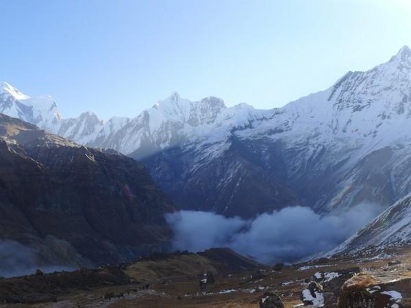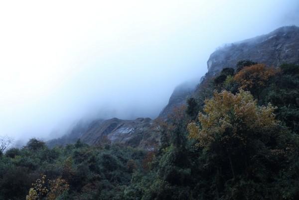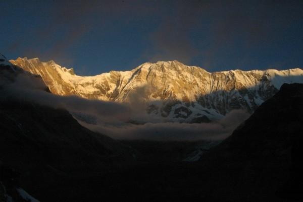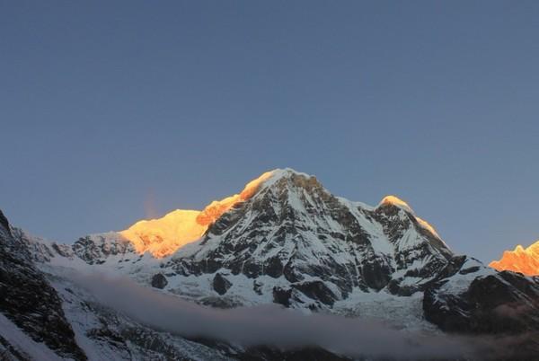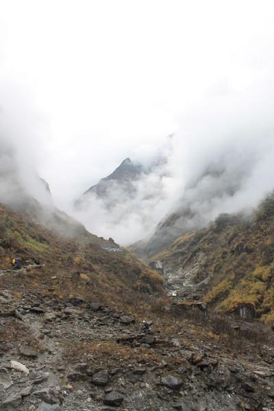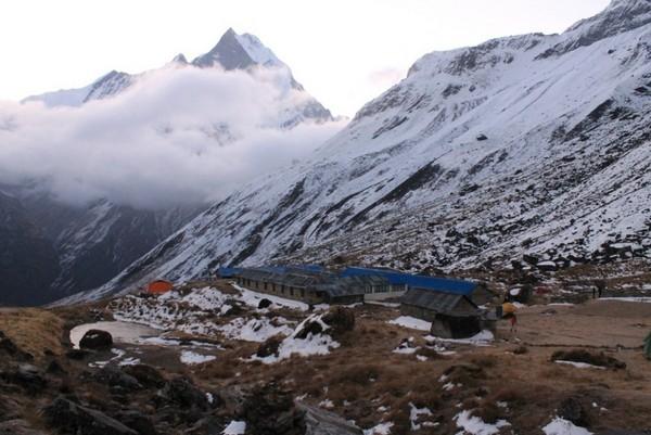 第四天也是ABC徒步的终点,我们会达到ABC安纳普尔那大本营,住一晚看日落,看日出,然后开始下撤。我们在12:45到达午休地点MBC,天气已经很冷了,喝了一碗姜茶驱寒,然后又喝了藿香正气水,如果在高原感冒的话是很危险的。下午是两个小时的路程,晚上五点左右我们到了ABC,这里海拔4130,而且天气是阴天所以温度只有零上五度。在餐厅的桌子下面是一个取暖的地方,很多人围着桌子吃饭聊天,烤火,可以把湿衣服烘干,盖上桌子边的毯子,非常舒服。每人也要收一百卢比。这里还可以打卫星电话,但是特别贵,一分钟三百卢比。吃饭的价格也在攀升,但是来到了ABC,多花点钱也是值得的。