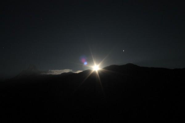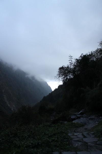 晚上6点的时候山里已经完全黑了,我们为了赶到向导找的旅店,决定走夜路,全部带上头灯,向导还是很牛的,只要由月光完全不用手电,他对山里的地形了如指掌。这个向导很精明,我们问还有多久到的时候,他说30分钟,当我们走了30分钟的时候还没到,他说还有20分钟,我们又走了20分钟还没到,他又说还有10分钟,反复几次我们已经不相信他了,索性走吧,我们一共走了2.5个小时的夜路,在晚上7点半的时候赶到了休息点landruk。后来我们商量,以后几天不能完全由向导安排住宿的地方,因为这些地方都是他能拿到回扣的地方,这也是向导直接告诉我们的。我们要按照自己的体力来走。
