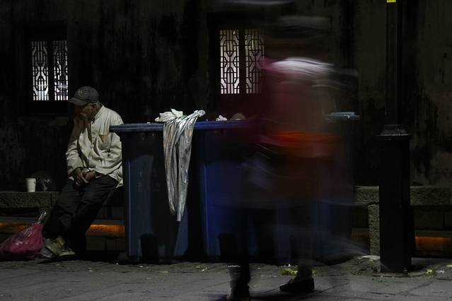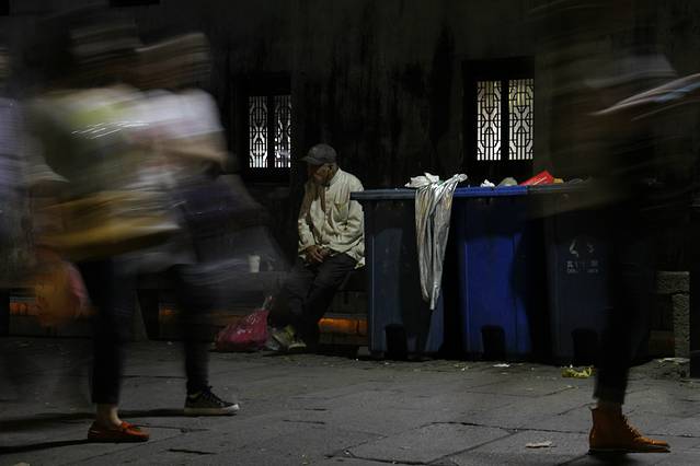 坐在河边的拾荒老人