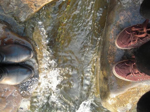 水终于没把石桩淹没,我们可以过河了,过跳石
