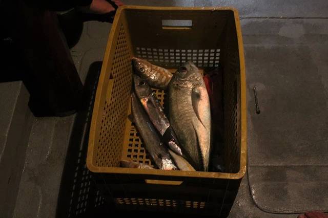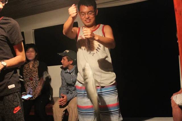 拍完照回来,预约的黄昏海钓要开始了~~~赶紧换衣服出海。出海的时候还是很美的晚霞,一会儿天色就暗下来了。这种海钓不用鱼竿,小黑们直接将切好的鱼肉块穿在钩子上系在鱼线上,我们将鱼线抛到海里,感觉到有动静就往上拉就可以了。一船人的收获不少,但都没有什么大鱼,我刚刚想问是不是这种鱼线钓不到太大的鱼呢,船头的一对母子就钓到一条鲨鱼!是的,鲨鱼╮(╯▽╰)╭,一米多长的大块头!但是鲨鱼是保护鱼种不能钓上来的,小黑将它拉到船边让我们好好参观了一番就放生了。