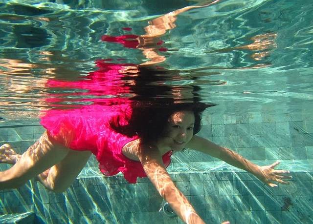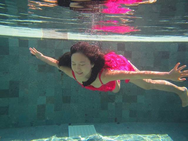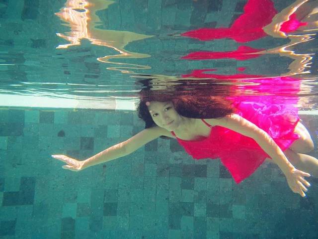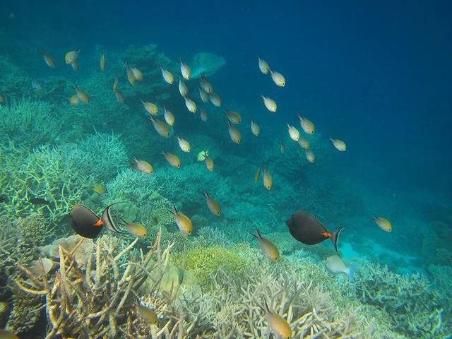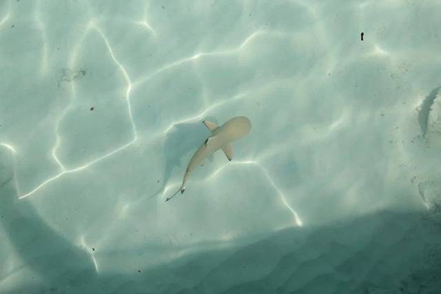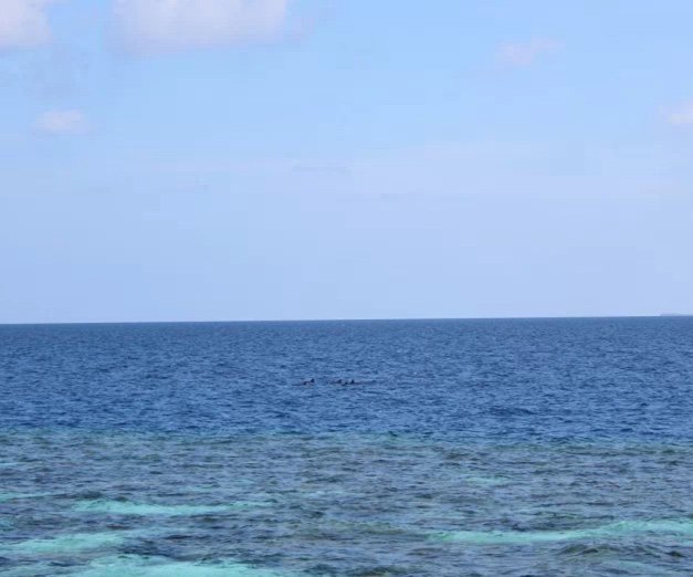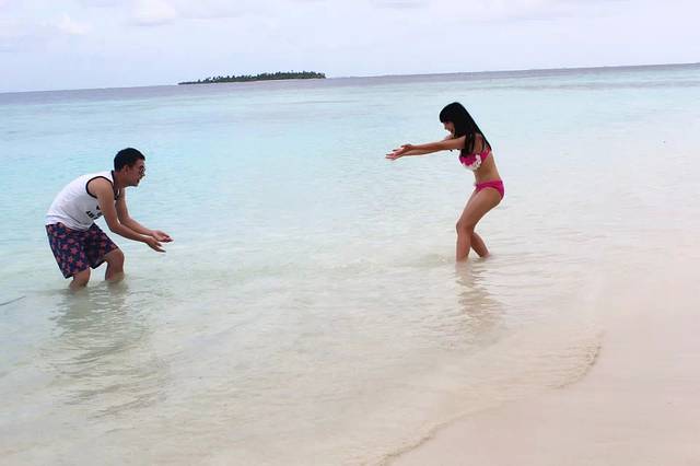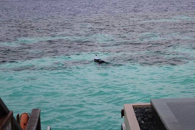 个人觉得岛上的活动可以尽量安排在沙屋的两天,因为住水屋的两天做两件事就够了:浮潜、拍照。我们的房间外就是很大一片珊瑚群,虽然没有出海浮潜那么美那么多鱼,但是对于一般游客也非常够了,涛哥就每天上午10点左右就开始下海,午睡后下午2、3点又开始下海,劲头十足啊。这时候我们带的潜水衣就派上大用场了,既防晒又保暖,还能防止珊瑚划伤,相当实用。非常幸运的是,头一天出海没有看到的海豚,第二天竟然成群出现在我们的水屋外!当时只顾惊喜了相机都找不到,等找到的时候已经游远了,照片不是很清楚,但是海豚们跃出海面的场景已经深深印在脑中。