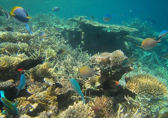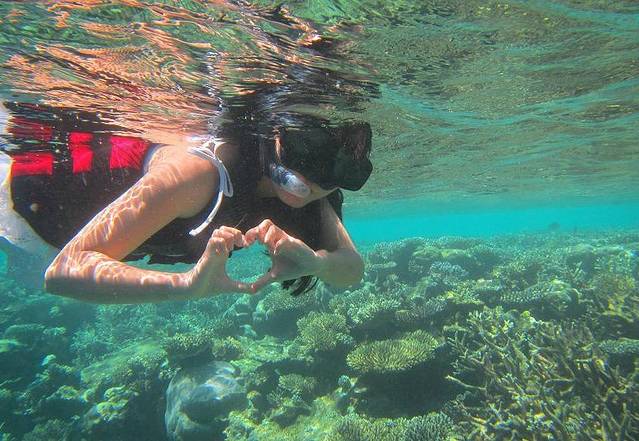 不过浮潜一开始,这些都被抛到了脑后,水下世界太美了,千姿百态的珊瑚群在眼前展开,五彩斑斓的鱼群就在身边穿梭,真的像置身童话世界。我把水下相机交给带领涛哥和我的小黑让他为我们拍照,然后就尽情地投入了浮潜。(顺带提一句一定要带水下相机去啊亲们,这样的美景不拍下来真的会遗憾的。我是在海鸟窝租的佳能D20水下相机,15元一天,拍出来的效果很不错,海鸟窝的服务很专业,还送了很多实用的小东西包括转换插头,特别满意。)