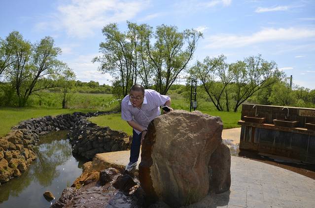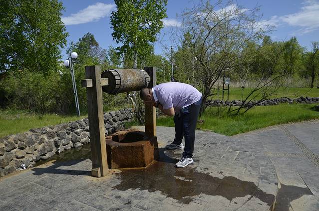 一路向东,没有什么好看的,就原路返回,到了药泉景区,去体验一下早已闻名就未相识的五大连池泉水,中午的时候,媳妇已经给我买了几瓶当地的矿泉水,她喝了一口,就说不好喝,我喝起来感觉还不错,和苏打水口感相似,有汽,爽口。药泉景区分南北泉,需要分别购票,但是车辆只能统一停放在南泉的门口,北泉门口不许停车。昨天宾馆前台的小姑娘告诉我,南泉洗浴北泉喝,我去的时候南泉门口正在施工,貌似无法通行,我是个怕麻烦的人,就没一探究竟,直接来到北泉,北泉的门票很便宜,20元,里面的景点也是真正的少。从大门一直向内,大概200米不到,有座亭子,左转,过了一座小桥,就来到了一个平台,平台上设计有供游人饮用的水龙头、有供人接水用的水龙头,还有一个大石头上在冒出一股小小的泉水。供饮用的水龙头使用时需谨慎,水压较大,容易溅的满身都是,我就不幸中招,被媳妇嘲笑了半天。过了平台,再走不远,就是泉湖瀑布,一个不大的小瀑布,落差一米左右,也算个景点,无语。过了瀑布,就是药泉湖,没看出来有什么特别,再继续前行,就是熔岩台地,是老黑山和火烧山流淌出的熔岩形成的一个面积巨大的高台,比老黑山的石海,石头形态更完整。但是没有老黑山景区的熔岩结构复杂多变。绕回到起点的亭子处,忍不住诱惑,买了一个塑料桶,接了5KG满满的药泉水,准备回家好好品尝,结果隔天回到家一看,泉水里的气体已经跑了出来,塑料桶鼓的像个气球,里面的水质已经变黄,也不知道能喝不能喝,弃之可惜了,喝又不敢喝,只好用来洗脸。