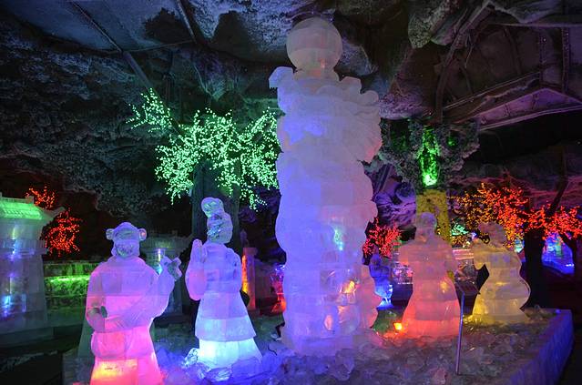 半天的时间看完老黑山景区,拿着地图左选右选,选中水晶宫+白龙洞、药泉两个景区,返回到镇上用两碗面条解决掉午饭问题后,向下一个景点出发,唠叨一句,午餐味道还是不错的,可惜想不起饭店名字了,位置在石龙北路的一堆烧烤店的中间。吃完饭,向前嫩高速方向前进,到达昨天左转弯的路口后,继续前行,不拐弯,水晶宫、白龙洞、龙门石寨都在此方向,自驾注意此路段是有限速的,小心违章。龙门石寨是旧时期火山喷发遗址,估计和老黑山景色差不多,直接pass,剩下的两个景点中先到达的是水晶宫景区,位于一座火山下方。景区不大,百余米长,入口犹如探秘金库,经过重重门关,即将推开最后一道门时,我们夫妻两人又返回入口,每人租了一件刘德华同款棉大衣,冷啊,景区内的特色就是在一个火山熔岩洞内立了若干冰雕,对于南方的游客,可能还有些新奇感,对我这从小东北长大的孩子,实在算不得什么新鲜玩意。甚感失望。于是也失去了继续下一个景点白龙洞的兴趣,因为从介绍上看,两个景区类型相似,只是大小规模有区别。