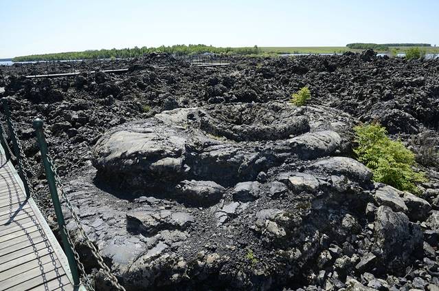 今天正式开始了游览,五大连池风景区占地广阔,分为老黑山、药泉、二龙泉、龙门石崖、白龙洞、堰塞湖等若干景区,景区之间相距较远,由于所在位置为县级市的一个镇,公共交通不是很发达,景区之间来往不是很方便,如果不是跟团或自驾的话,可以选择包车,建议提前计划好景点浏览顺序。昨晚在询问过宾馆的前台后,我今天游览的第一站,选择了火山群中最新一座--老黑山,它于1720-1721年喷发过。车辆需停放在景区门口,景区门票80元,景区内游览车25元,游览车直接将你拉到老黑山脚下,途中的五色沙滩、老山杨等景点只能匆匆而过。下了游览车,就可以在栈道上近距离接触熔岩冷却形成的“石海”,即使不是地质爱好者,也会被大自然的神奇力量所震撼,沿着栈道缓缓前行,参观完石海,在爬山的过程中,会路过一个熔岩内部的洞,洞的名字记不太确切了,洞内进不去,只能在洞口看看,因为洞内满满的都是冰,在火山熔岩的内部居然有洞穴都是冰,怎么形成的呢?很好奇,很纳闷。路过熔岩出口后,大概爬山20分钟左右,就会到达老黑山山口,山口其实没有什么看的,就是一个大坑,媳妇笑说:“我们是,傻子领着傻媳妇,累了一天,来找坑。”火山口没什么看的,不代表山顶没什么,老黑山是整个景区的最高点,站在山顶可以观看到整个景区的全貌,从十四座火山到五大堰塞湖,从火山熔岩到居民住宅,无限风光在山顶。从山顶而下,在山脚下的停车场,可以坐游览车去同一景区的另一景点--火烧山,只需要出示在景区门口购买的游览车票,游览车为五菱特制的,四周无窗,在去的路上,会介绍途径的景点,回来时如果有照相的要求,和司机提出来,司机会在适宜照相的地方减慢速度。本来以为还会像老黑山一样,拉到山脚下再爬山,就一直在犹豫,去还是不去,在纠结一会以后,决定去,都已经来了,不去可惜了,结果没想到,游览车只是去往火烧山方向,终点是个看火山锥的地方,和石海类似,但是大的小的喷气锥好多,其中有种喷气锥学名叫饼状喷气锥,我看着就像一堆放大了若干倍的便便。