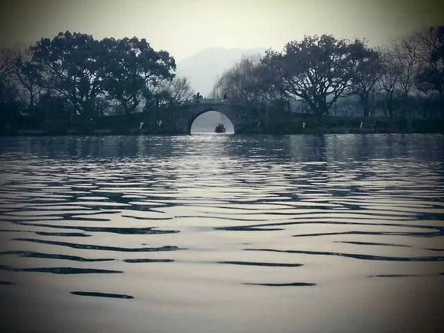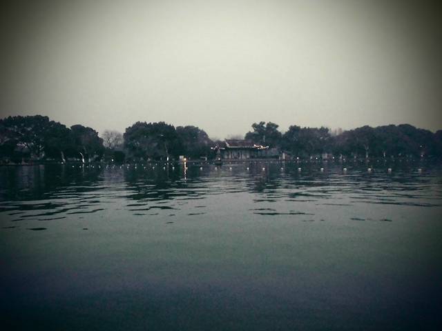 从飞来峰回来,我们就直接去夜游西湖了O(∩_∩)O哈!,说是夜游,其实也就是5点多钟。我们很幸运地赶上了最后一班浆划船(小船,一个船上可以坐4个人),一个人50。在西湖中游一圈,可以近观三潭映月。由于我们去的时后船都快下班了,所以湖面上并没有多少游船,还有点儿雾蒙蒙的感觉。冬天的西湖晚上没有演出TOT