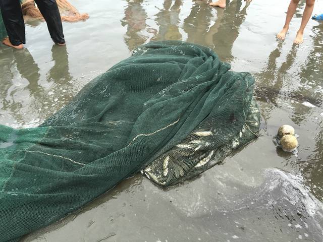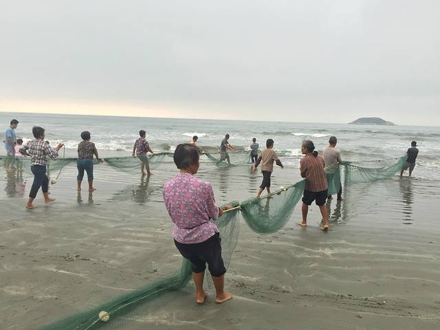 第二天早上定的五点,想看日出,可是天不遂人愿,好大的雾啊,浪也超大,头一天温柔的大海消失不见了。把床上睡得香的两个人揪起来赶海,看到渔民在那里捕鱼,也算是开了眼界了。等那一家子也起来了就去镇上吃吃早餐(说是早餐,其实快中午了)肠粉之类的小吃味道不错。之后又是下海玩耍的时间啦,大人都觉的晒得吃不消,两个孩子却不亦乐乎。