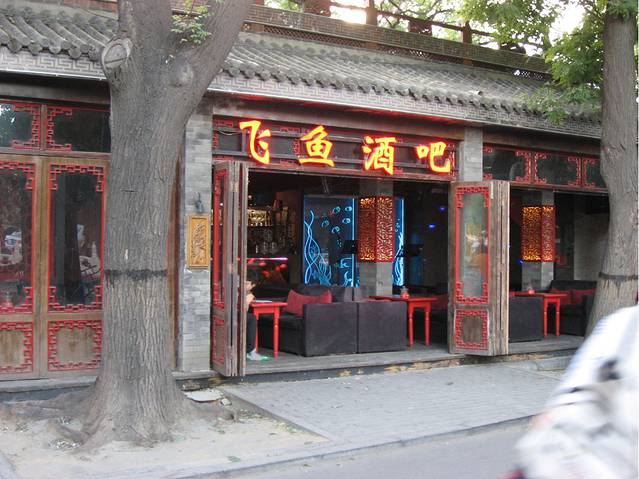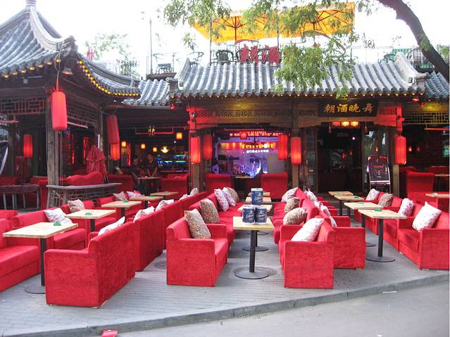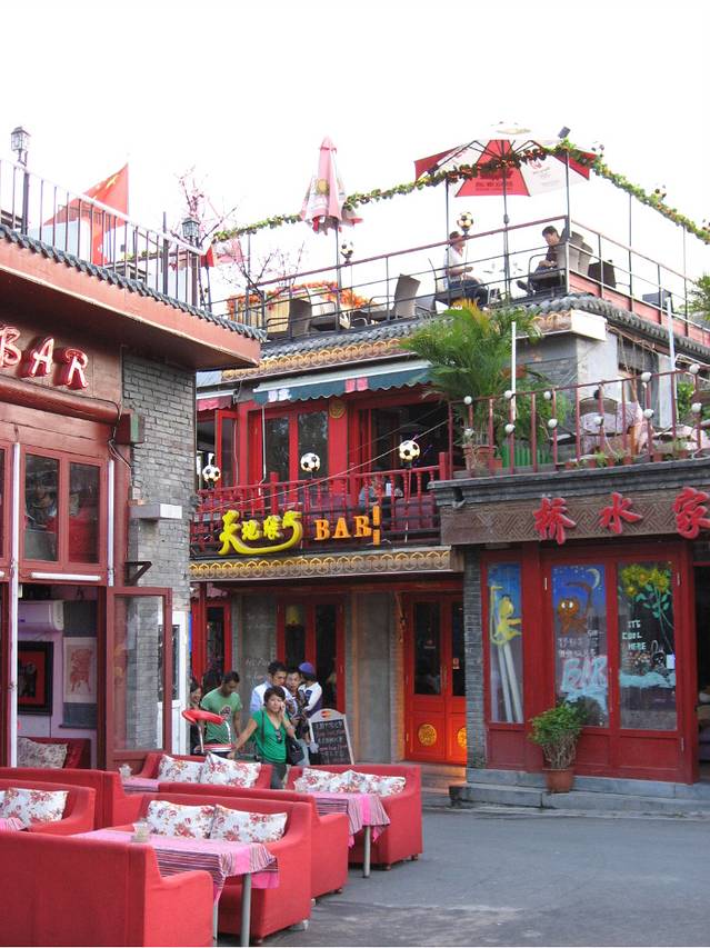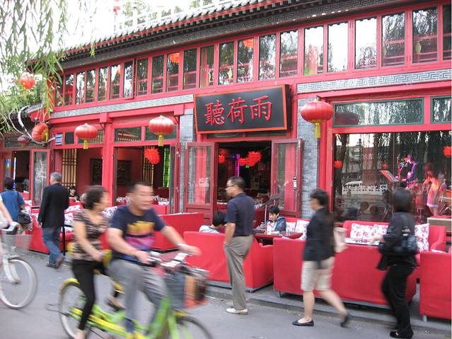 过了银锭桥,沿着前海向东南方向走,从荷花市场北门进入,又有几家著名的饭庄子:全聚德,同和居坐镇其中。继续向南就是一家挨着一家地紧密排列着的十多家酒吧食肆。