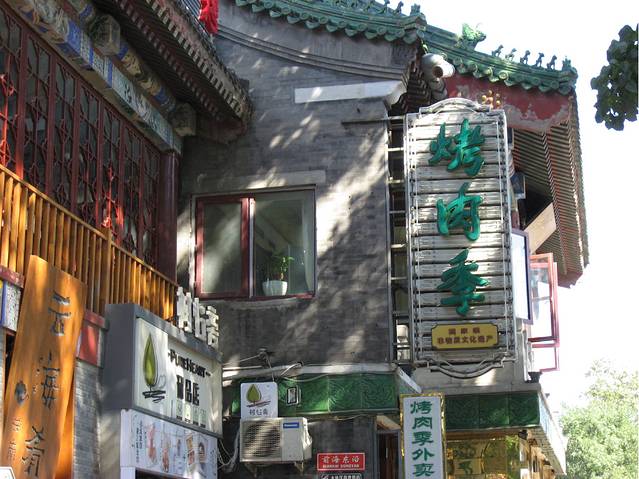 “烤肉季”牌子左边的那扇窗子就是“观山”的最佳位置。雨后初晴的日子,空气被雨水透透地洗过之后,清新而透彻,从此窗向西面远眺,远处连绵起伏的西山就像一幅优美的水墨画一般,清爽明丽地呈现在您的眼前,此刻把酒临风,岂不诗兴大发,豪情顿生?哈哈哈哈哈