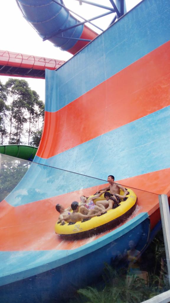 5.喷射滑道。这个项目可以2-3个人玩。如果您是只有2个人去水上乐园,那么到了这个项目您就会感叹,终于不用再找人来凑数啦…这个项目其实也没有太多惊险的地方,只是有几处从上往下冲的时候,由于两个人是前后坐的,坐前面的人会有垂直往下的感觉。。。。出于安全考虑,工作人员会要求体重轻点的坐前面。。。如果是1男1女上去玩,受惊吓的恐怕多数是女性。