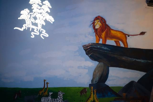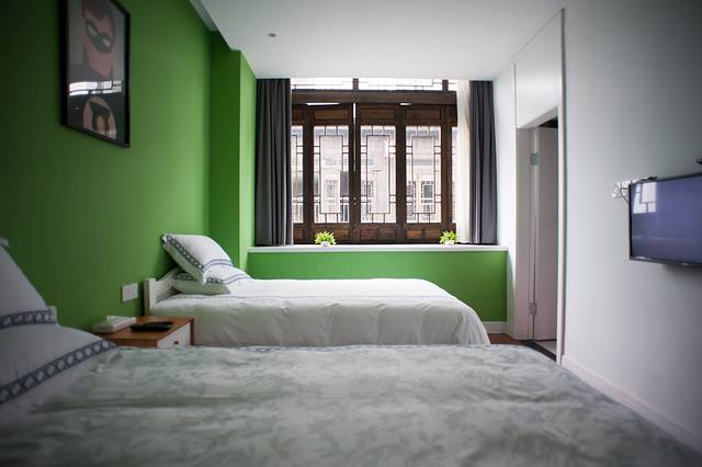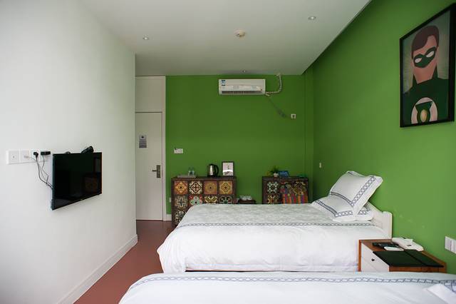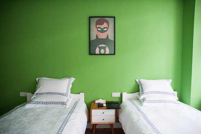 这里每个房间都有着自己的童趣主题,来到方块艾斯间,满墙的绿色看着很清爽,还有很多公仔装扮其中,趣味十足,推开窗户竟然还可以看露天电影,简直棒极了!
