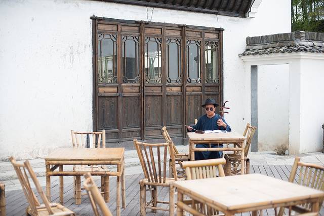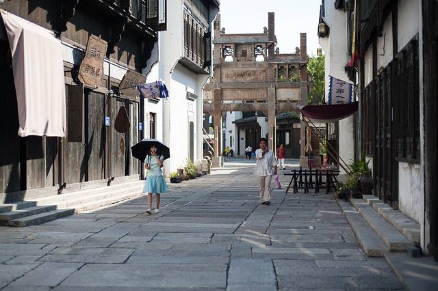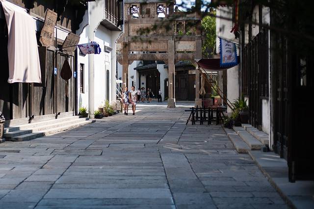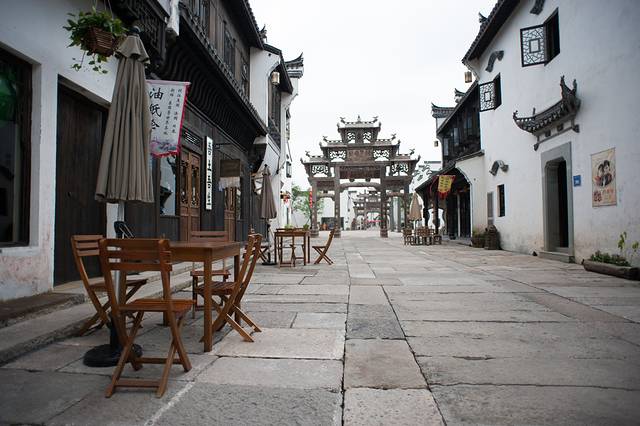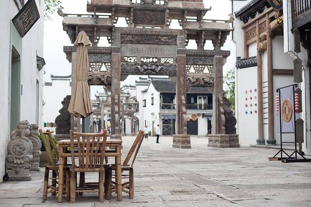 停下脚步,靠在路边,举目四望。街道正中的牌坊沿着石板路依次展开,矗立在文渊狮城街头巷尾,一排排桌椅沿街摆放,两旁的民居或商品大致两层高,错落不一,或精或简,但整体色泽一致。