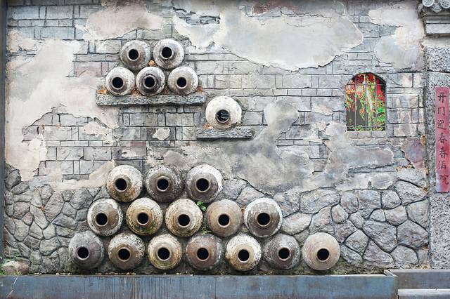 在一个拐弯处的墙壁上,看到很多瓦罐镶嵌在墙壁上,本以为只是为了装饰,走进一瞧,原来瓦罐里有水;又以为可以喝,谁知是用来洗手的~~~