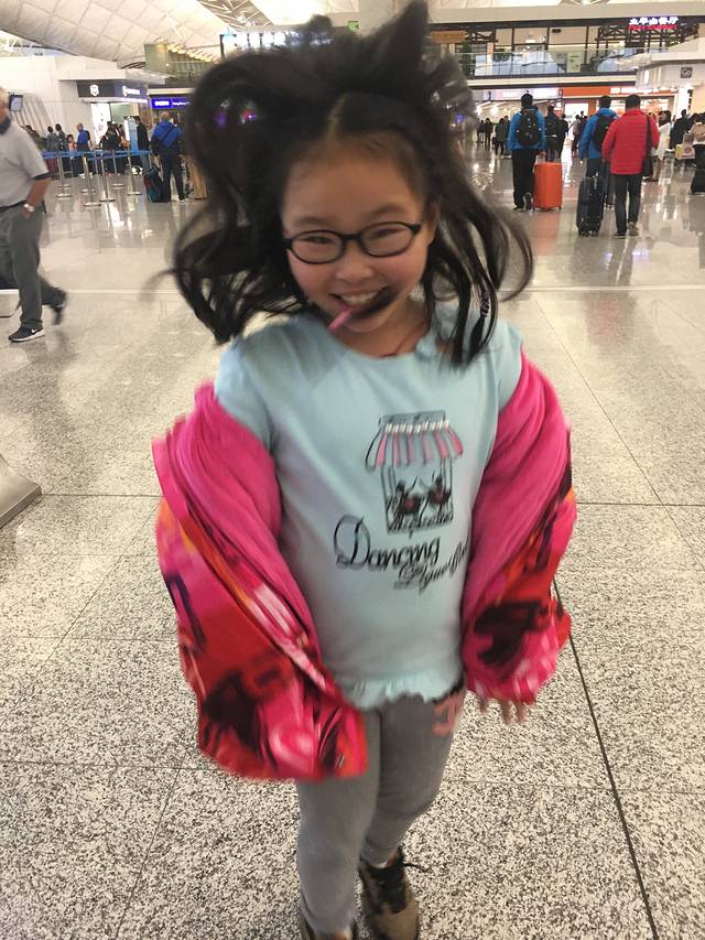 机场半夜还是会有点冷,多穿一点衣服就没事啦,一觉起来宝贝又满血复活,听到要登机了,高兴的头发都飞舞起来