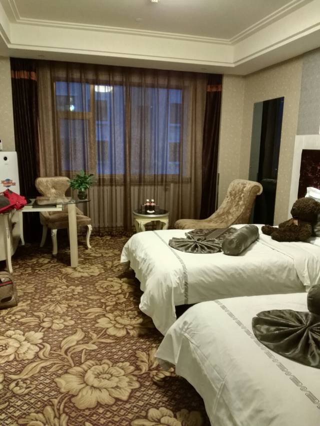天还没亮,接站的酒店人员已经在出口处等着了,一身尼毛长外套的漂亮姑娘。帮我们拿东西,还特意打开手机手电筒为我们照明,带着我们上了酒店的小巴。一上车一人一瓶矿泉水。说是,这班火车站经常早到,所以他们也提早过来接我们。服务确实挺到位。 路上,酒店人员还推荐我们包车旅行。这家酒店除出提供住宿还有包车旅行服务。