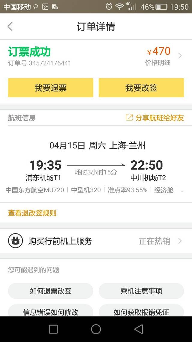 设计行程的一开始,因为习惯用飞猪,所以机票是在飞猪订的(后来综合考察比较后,更多的预订用去哪儿)。订的是这一天第二便宜的机票。其实如果当时知道包车去上海的话,完全可以订最便宜的那个航次,还能早一个小时到兰州。坐位利用提醒功能,值机后,在手机上订了两个靠窗的。靠应急出口的两排位置前面空间大更舒服些,但不知是不让订还是被抢了,反正没一回订到过。