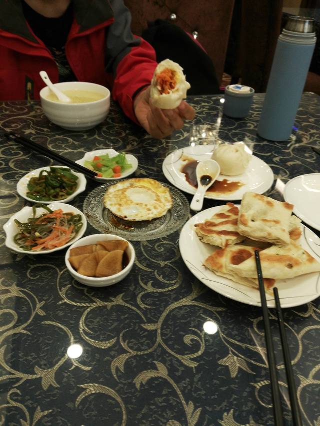 收拾好,稍作休息,出门找吃的。早七点,天已经全亮了,就在酒店的斜对面有家开着的早餐店。