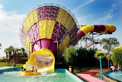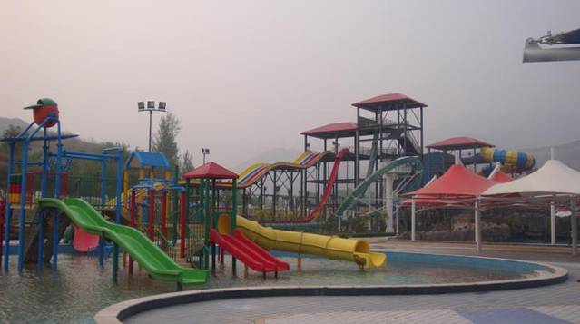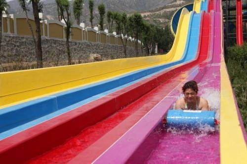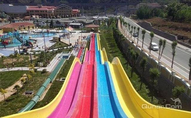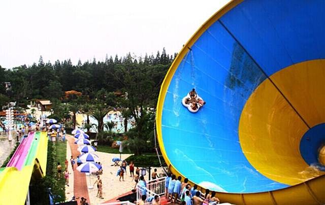我坐了这个三级滑梯旁边的垂直下落 的 滑梯,一向胆子比较大的我 ,竟然 在下降的一霎那害怕了 ,不敢睁眼睛,它和这个三级滑梯一样高度,但是没有缓冲,直直的就下落了,也不用垫子,自由落体,那速度,水花四溅,几乎没有女生敢玩。就是下图中远处那个红色的几乎垂直的滑梯。