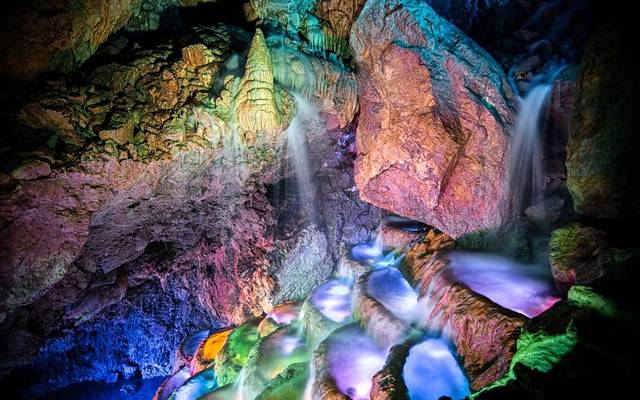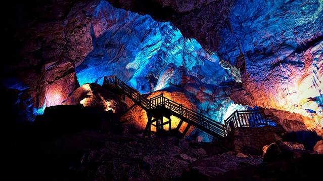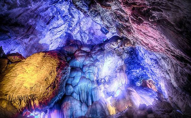 一般溶洞里的钟乳石、石笋、石柱、石花、石幔都是乳白色或土黄色的,而这里溶洞,由于岩石含多种矿物质,所以色彩缤纷,美轮美奂。