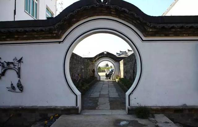 两座圆形拱门之间的通道连通村两头,不长不短的过道两边墙上用农村传统瓦片做了装饰,也算是一种妙用。