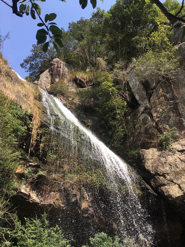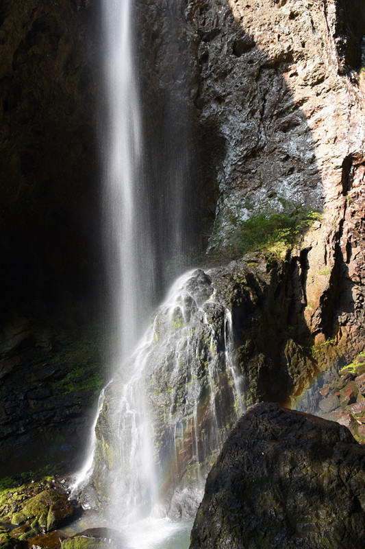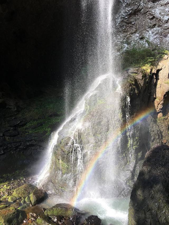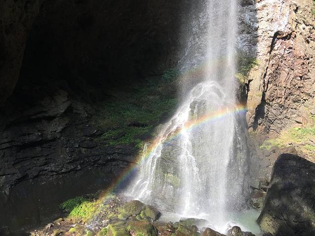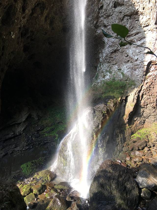 天坑彩虹瀑布 天坑瀑布似从天上来,人在天坑中仰望天空,有如井底观天,一方天空别有韵味。只要晴朗的日子,每当阳光照到瀑布时,都能看到一道或两道彩虹。