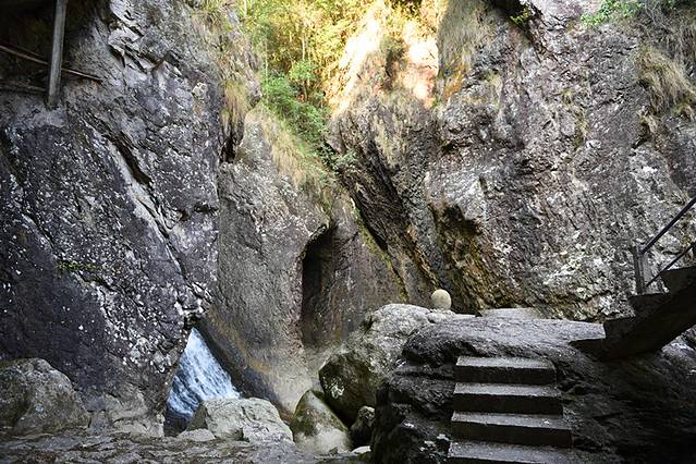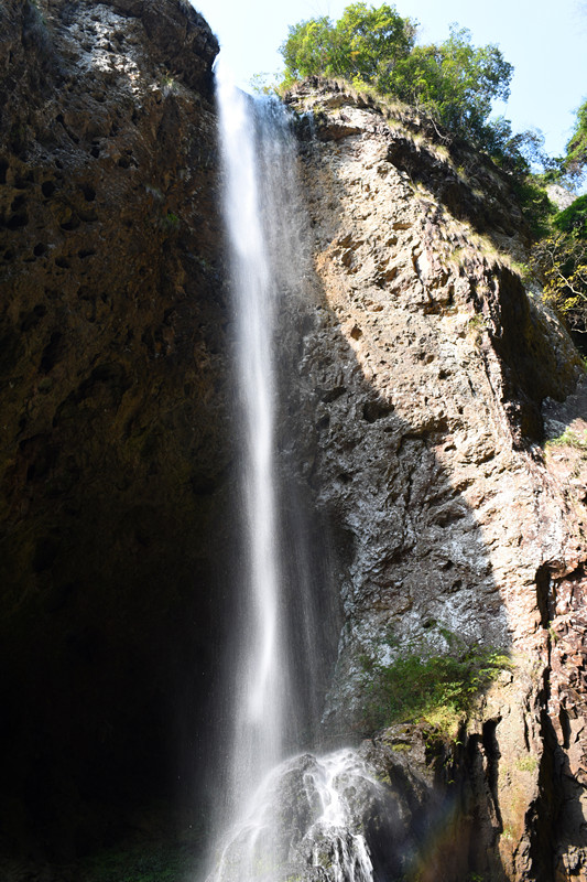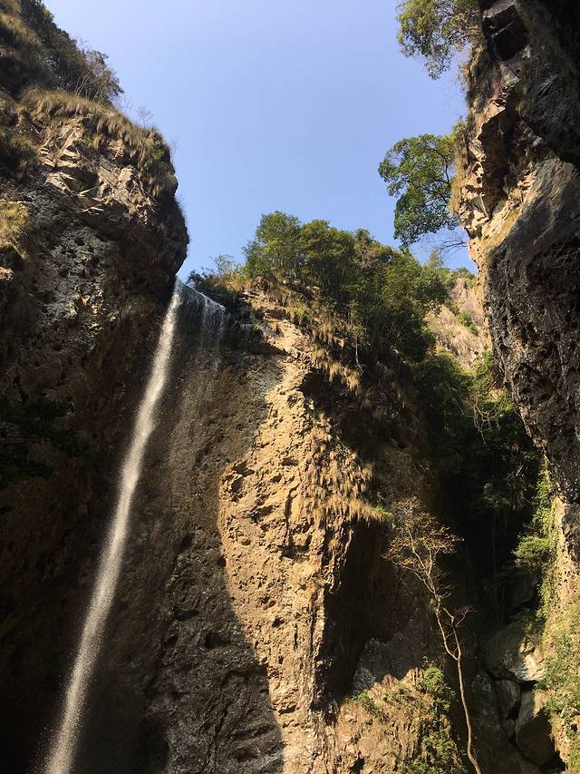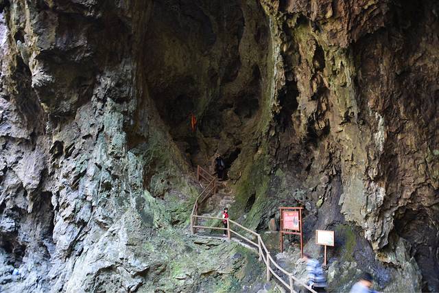 悬崖绝壁要数百洞峡最具奇观, 峡长百米,岩高百米,与对面悬崖合成峡,与侧面瀑布震出雾。气温与外相比差10度。