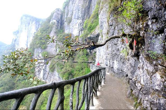 道路慢慢变得狭窄起来,一列古色古香的栈道横亘至远方,看不到终点。