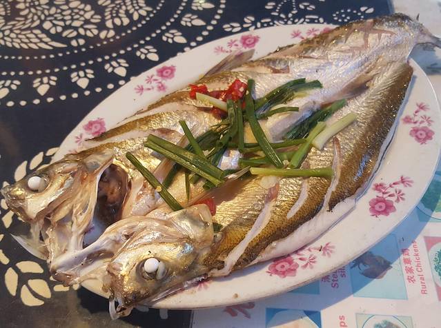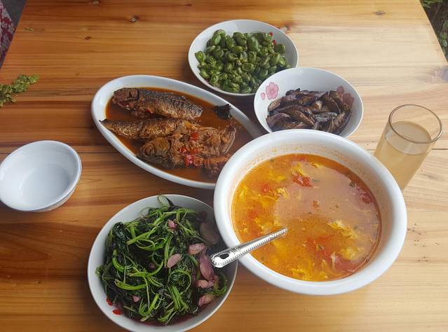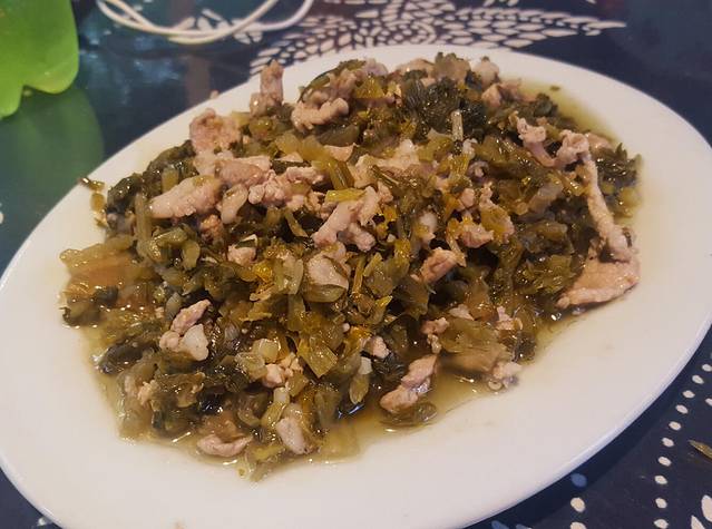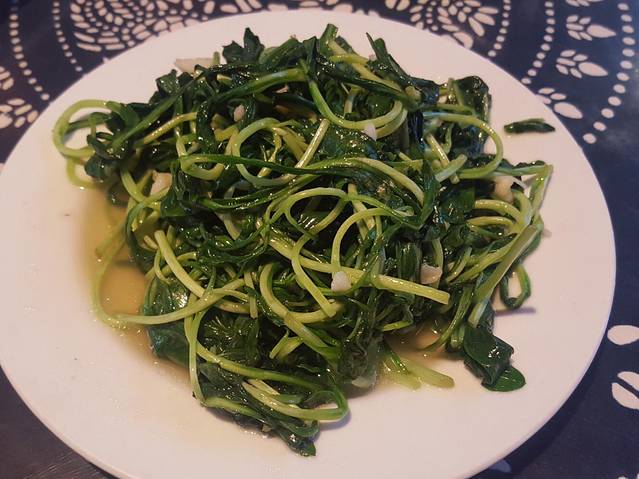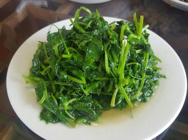 炒时蔬:周庄统一菜谱后菜色都差不多,时蔬有丝瓜尖、菠菜、油菜,还有一些当地菜组成。