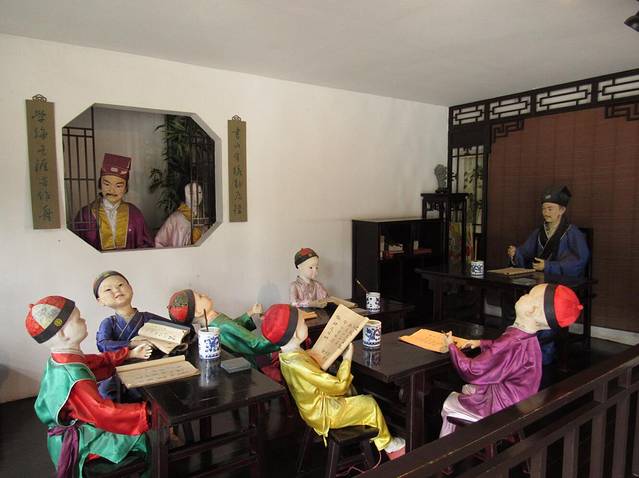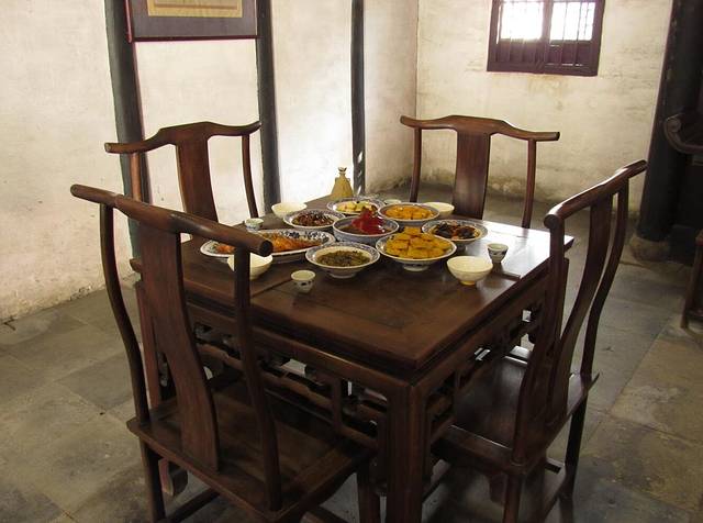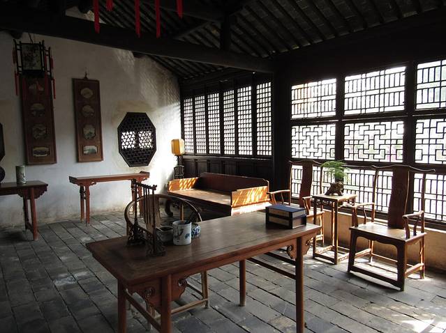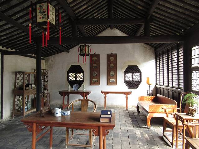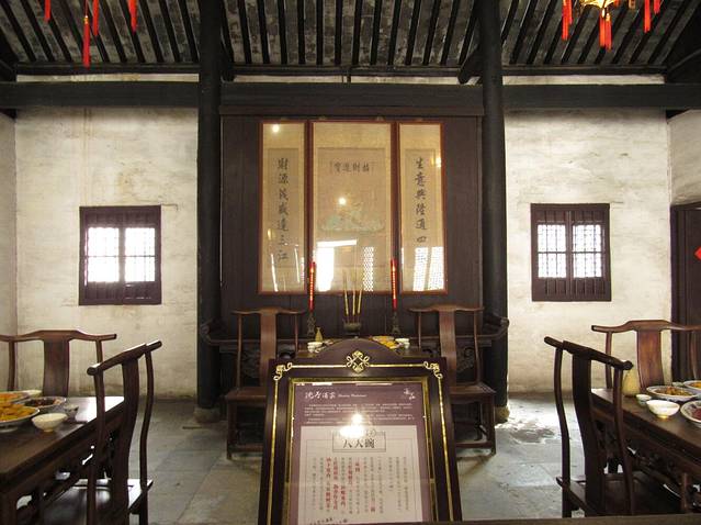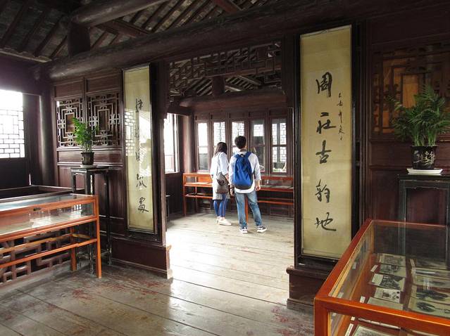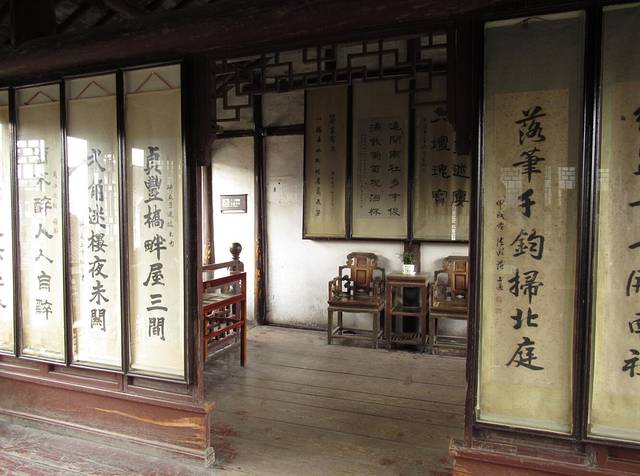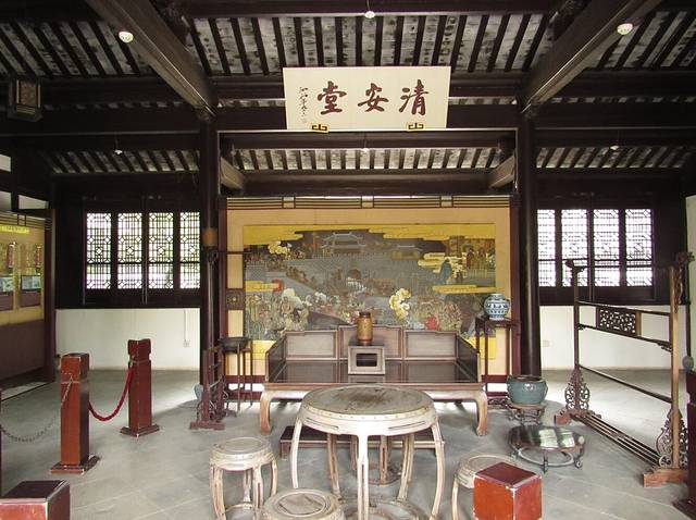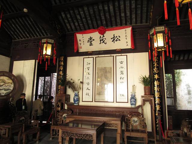 厅堂内布置着明式红木家具,张灯结彩,迎送宾客。墙上悬挂着字画,—副对联尤其引入注目,上联是轿从门前进,下联是船自家中过。仔细琢磨,对联十分贴切地写出了张厅的建筑特色。