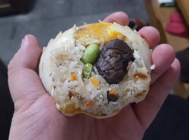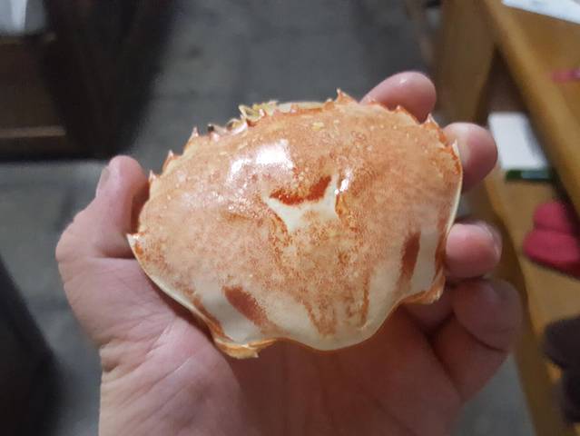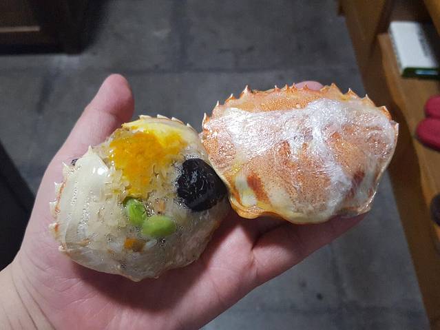 这里的蟹八宝并没有蟹黄,而是将胡萝卜、青豆、玉米、香菇等馅料与米饭揉成团,点上一些鹅蛋黄后,放置在蟹壳里蒸熟,因此也被称为:素蟹八宝饭。