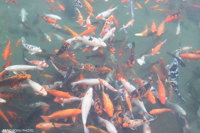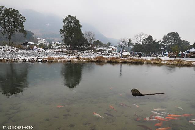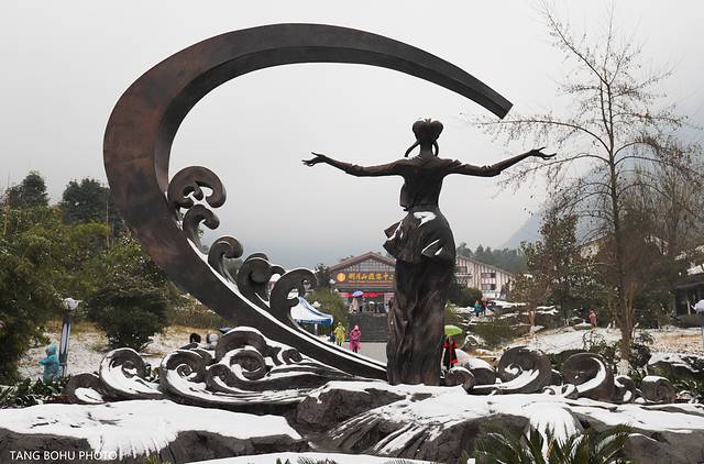 后面前来明月山的观光的车越来越多,可惜景点关门了,那些开车来的无奈只能开回去了。不过,在门外面也有不少雪景可看的。门前一处水池里各种颜色的鲤鱼正在水里游着,外面零下1度鱼感觉不怕冷一样。周边的树上,道路,房子都被白白的雪所覆盖了着。一处处雪景给明月披上了一件白色的外衣。边明月的标志性女神雕像也被白白的雪盖着。下雪天的明月山格外美丽。