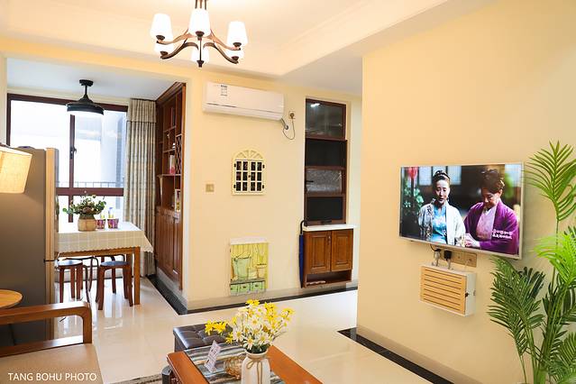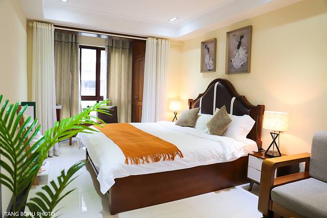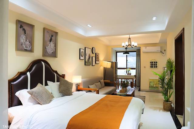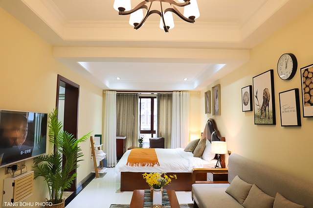 拉着行李上了电梯到了门口,输入电子密码,门就开了,当我打开民宿的那一瞬间被惊喜到了,一股清香的味道扑面而来,是我喜欢的民宿,一进民宿最让我看到的是旁边的厨房,然后就是到达客厅,宽敞的客厅,灯光明亮,再走近去一张超大的床,被套摸上去舒服。再往最里面走去就是小小的书房了,旁边阳台变成以了水池,开出来的水就是温泉。
