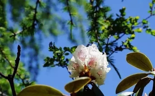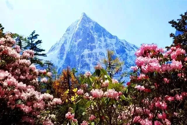 杜鹃花,羌族人民又称其为羊角花,颜色或艳而不俗、或雅而不寡。毕棚沟羊角花以粉色居多,每到五月就苏醒似的灿烂起来,绿野山头漾满了粉色的波浪,馥郁的香气在空中酒样泼洒。