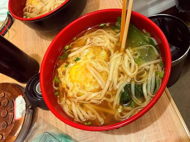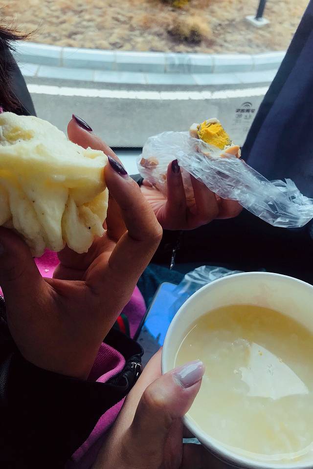 本来计划包车去酒店的,路上还能下来拍拍照。后来一个酒店老板说现在路上什么都没有,你们还是老老实实坐大巴车好一些。在机场买了点早餐,满满的屌丝气质溢出屏幕,会会姐一直担心,我会不会把这碗汤呼在脸上,哈哈。
