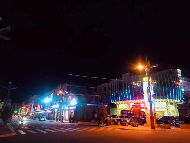 酒足饭饱,溜达着会酒店去。街上人并不多,很安静,但是雪山广场上却很热闹,很多人围在一起跳锅庄舞。一下就来了兴趣,一溜小跑过去跟着跳了起来,但是这手笨脚笨的,跟不上节奏,一看就是跑来捣乱的,哈哈。