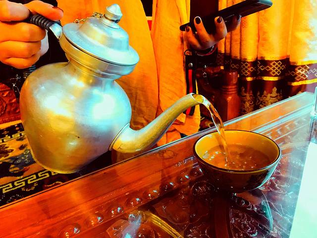 酒店对面有一家卖藏服的,拉着会会姐,想去试一试。结果遇见了这几个姐姐,聊得太开心了。给我换上了美美的藏服,老板还嫌会会姐拍照不行,自己拿着手机给我拍,哈哈。姐姐家自己做的酥油茶也是很好喝了,而且说是能够缓解高原反应。