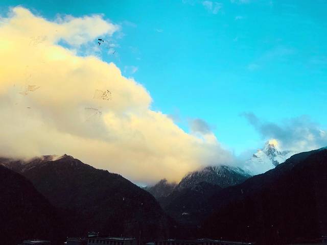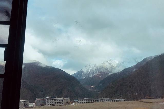 第二天睡到9点多,脑袋还是疼的不行,会会姐也不舒服,纠结着今天的行程要不要继续。拉开窗帘,我们的房间正对着仙乃日雪山,这景色简直太美了。