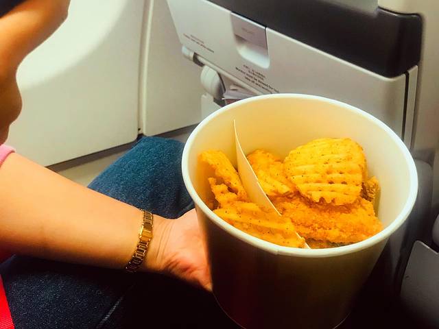 会会姐正在健身,不能多吃,我去买全家桶的时候口口声声说着不要,结果上了飞机,瞬间我们就把这一桶解决完毕,教练估计已经哭晕在健身房,哈哈哈。
