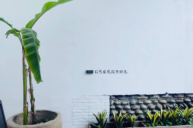 公众号上推荐的这家木口后院,还算比较好找,需要从一个门洞走上二楼才能看到。一进去就被这句话打动了,后然虚度,院里时光。