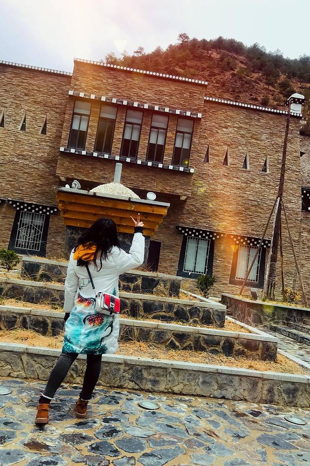 差不多11点半到达亚丁景区附近,一下车就看到了这个可爱的小房子,兴冲冲的跑过去拍照。旁边还有一个用木头围起来的小院子,也不知道是什么就跳进去了,会姐说怎么味道怪怪的,好臭啊,你不会是跳进猪圈了吧。后来证明,我确实是跳人家猪圈里了,哈哈哈哈。